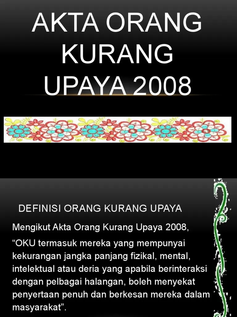 • tiada sesiapa yang boleh. Mengikut akta orang kurang upaya 2008, "oku termasuklah mereka yang mempunyai kekurangan jangka panjang fizikal, mental, intelektual atau . Kad oku ertinya kad yang dikeluarkan di bawah . Penubuhan majlis kebangsaan bagi orang kurang upaya dilaksanakan di bawah seksyen 3(1), akta orang kurang upaya 2008 (akta 685). Mohammad faizal bin che yusof, peguambela & peguamcara.
